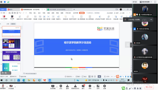 本期沙龙活动的主讲人是清华大学学堂在线黑龙江省项目经理李彦辉老师。沙龙活动中,李老师对“雨课堂”在线教学平台进行了全面介绍,详细说明了“雨课堂”专业版平台工具的内容与功能,结合具体实例对利用“雨课堂”进行教学的课前准备及有效进行混合式教学程序进行了演示,与参加活动教师线上交流了“雨课堂”专业版及学堂在线学分课资源的应用。在互动环节,李老师对教师提出的“如何撤出‘雨课堂’平台同步的课程教学内容”“如何将‘雨课堂’公共版教学数据同步到专业版”“如何在直播过程中组织学生进行分组讨论”等问题进行了详细解答。