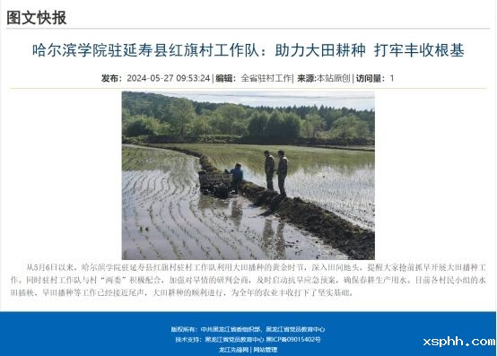 媒体聚焦 首页 - 媒体聚焦 - 正文 龙江先锋网“全省驻村工作”专栏报道我校驻村帮扶工作 浏览量:时间:2024-05-30 近日,我校驻延寿县延寿镇红旗村工作队利用大田播种的黄金时节,积极主动深入田间地头,提醒大家抢前抓早开展大田播种工作。龙江先锋网“全省驻村工作”专栏以“图文快报”的形式对此进行了报道,这是省级驻村官媒对我校驻村帮扶工作的首次报道。 原文链接:龙江先锋网:https://www.ljxfw.gov.cn/hljZcfp/detials.html?siteId=36FE605A28C7DABDE5FEC447D28F4814&nodeId=9FF0E3D94B79E35DB03A82529016B7F7&infoId=9998D6462624D147C1D0C5B93EE692FC&className=%E5%9B%BE%E6%96%87%E5%BF%AB%E6%8A%A5