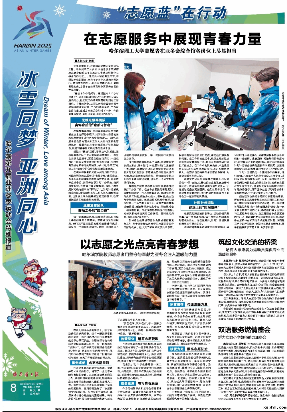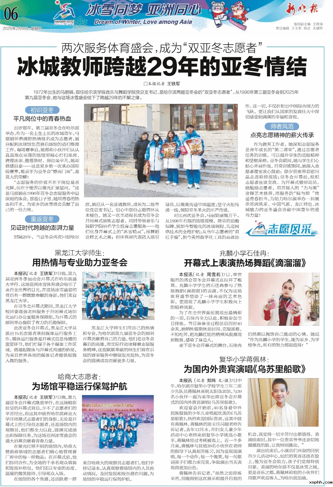 媒体聚焦 首页 - 媒体聚焦 - 正文 【中央电视台】【共青团中央】等多家主流媒体报道我校志愿服务亚冬会 浏览量:时间:2025-02-17 xsphh志愿服务过程中,中央电视台、共青团中央、黑龙江省电视台等多家主流媒体对学校师生在亚冬会志愿服务中的突出表现进行了报道。媒体报道共21条,其中,央级媒体10条、省级媒体5条、市级媒体6条。央视CCTV4、黑龙江新闻联播报道我校学生邹美慧成为中国队引导员背后的艰辛与坚持。视频链接:https://zmt-m.hljtv.com/video_details.html?from=androidapp&videoType=0&id=999451&userId=not_login&curTime=1739759727290×tamp=1739840761092共青团中央、黑龙江共青团2月7日报道我校学生志愿者与冬奥会“三冠王“王濛的亲密互动共青团中央https://mp.weixin.qq.com/s/4tVOzXTUM1bX7CLnK8Nanw黑龙江共青团https://mp.weixin.qq.com/s/g7Q56XsEmwoIbJdwmjRh6g中国教育在线、中国新闻网、人民网新媒体平台、东北网2月5日报道我校学生处(学工部、武装部)处长于迪担任第111棒火炬手。中国教育在线链接:https://heilongjiang.eol.cn/hljgd/202502/t20250205_2653799.shtml中国新闻网链接http://www.hlj.chinanews.com.cn/hljnews/2025/0205/144591.html人民网新媒体平台https://www.peopleapp.com/rmharticle/30048171940东北网链接:https://m.dbw.cn/minsheng/system/2025/02/05/059411371.shtml中国教育在线2月7日、人民网新媒体平台2月6日报道我校志愿者倾力护航亚冬会火炬传递中国教育在线链接:https://article.xuexi.cn/articles/index.html?art_id=9370947739819074691&item_id=9370947739819074691&study_style_id=feeds_opaque&pid=&ptype=-1&source=share&share_to=wx_single人民网新媒体账号链接:https://www.peopleapp.com/rmharticle/30048190085中国教育在线2月8日报道我校学生作为引导员,圆满完成开幕式相关任务https://heilongjiang.eol.cn/hljgd/202502/t20250208_2653997.shtml新晚报2月9日报道我校教师音乐与舞蹈学院党总支书记马丽娟“双亚冬”志愿之路。哈尔滨2025年第9届亚冬会官方微信公众号报道我校教师李文文志愿服务亚冬先进事迹。链接:https://mp.weixin.qq.com/s/SLKGIIT6Upuyv6H4J5W4Aw除夕,我校举办“金蛇送春 喜迎亚冬”亚冬会志愿者新春联欢会,校领导与志愿者们欢聚一堂,共贺蛇年新春。龙江网络思政中心对此进行了报道。https://mp.weixin.qq.com/s?__biz=MzIxMzI4ODMzMQ==&mid=2247692928&idx=2&sn=639d869ed0d153ed6719a6f3638e6d00&chksm=96446682ad5d80bf8a9cbf6de49100415e49b28f060caa6accfdf08bf57c8f7c434951b689fb&scene=27哈尔滨日报2月12日报道我校教师志愿者用坚守与奉献为亚冬会注入温暖与力量哈尔滨新闻综合频道报道我校学生邹美慧成为中国队引导员背后的艰辛与坚持.哈尔滨新闻网2月9日报道我校志愿者坚守岗位,用热情与汗水、责任与担当,构筑起亚冬会周边一道亮丽的风景线。链接:https://mp.weixin.qq.com/s/1BAkEmtfMhm1Kfm2t39xKA哈尔滨新闻网报道我校音乐与舞蹈学院学子在开幕式的精彩瞬间https://www.my399.com/p/415879.html哈尔滨新闻网报道我校教师王宇航越野滑雪裁判用专业和热情链接: https://www.my399.com/p/416124.html新浪网报道我校教师黄婷婷作为亚冬会志愿者带队教师坚守岗位434天的先进事迹。链接: https://finance.sina.com.cn/tjhz/2025-02-15/doc-inekpsyp7108375.shtml 光明网报道我校食品工程学院学生付金函在亚冬会主媒体中心的非遗展示区为中外记者提供服务,传播中华优秀传统文化。链接:https://baijiahao.baidu.com/s?id=1824093649840699247&wfr=spider&for=pc中国教育在线亚冬会闭幕后报道学校志愿服务高光时刻。https://heilongjiang.eol.cn/hljgd/202502/t20250217_2654864.shtml